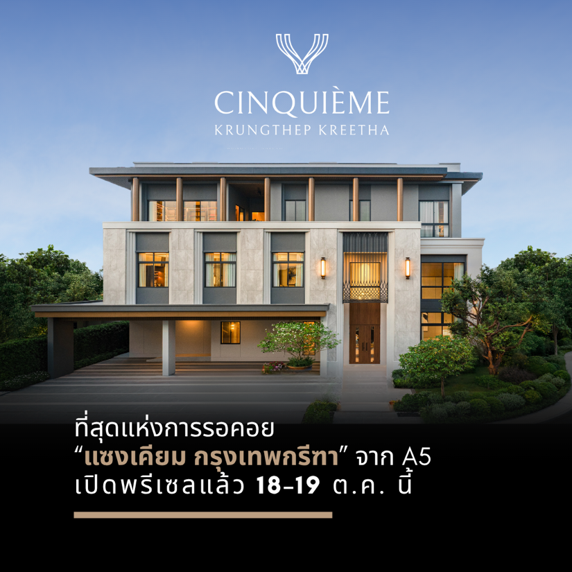 บริษัท แอสเซท ไฟว์ กรุ๊ป จำกัด (มหาชน) หรือ A5 ผู้นำด้านการพัฒนาอสังหาริมทรัพย์แนวราบแนวสูงระดับลักชัวรี เตรียมเปิดพรีเซล โครงการใหม่ “Cinquième Krungthep Kreetha” (แซงเคียม กรุงเทพกรีฑา) บ้าน Private Pool Villa หรูระดับ Ultra Luxury จำนวนจำกัดเพียง 16 ยูนิต ภายใต้แนวคิด “The Fifth Dimension of Privacy Living” ที่เน้นความเป็นส่วนตัวและคุณภาพชีวิตในทุกมิติ