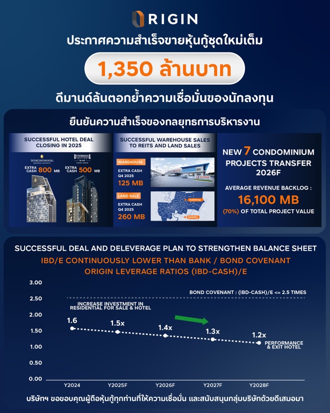 ออริจิ้น พร็อพเพอร์ตี้ ประกาศความสำเร็จขายหุ้นกู้ชุ